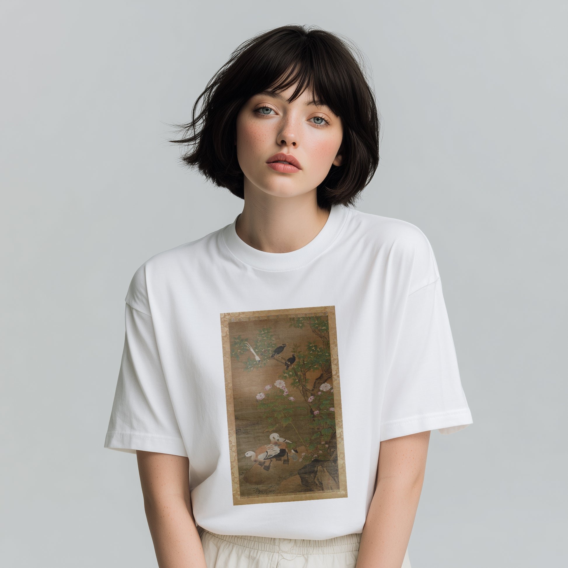 本作は四季をテーマに四幅対で描かれたうちの「秋」にあたるもの。キク・キンモクセイ・フヨウの花々、キュウカンチョウ・アカツクシガモ・サンコウチョウが格調高い構図で配置されています。呂紀の最高傑作ともいわれ、室町以降の日本にも影響を与えました。