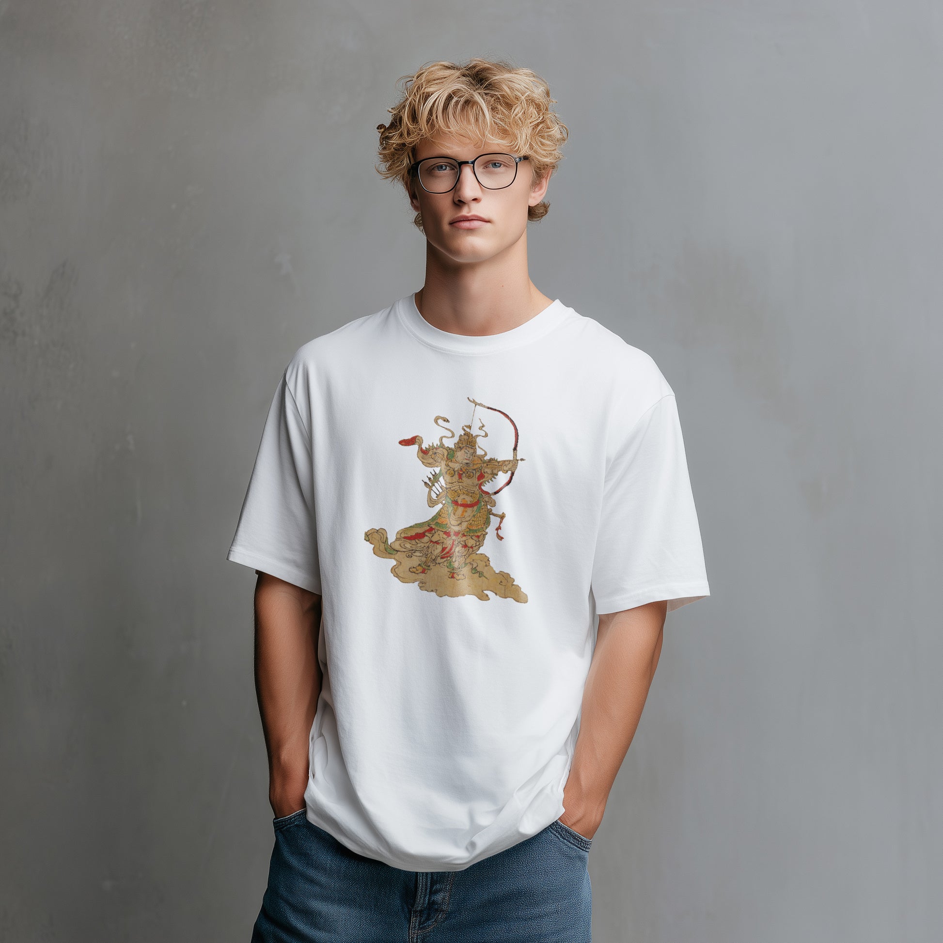 辟邪とは魔除けのことで、人に害や病苦をもたらす悪鬼を退治する善神が描かれています。毘沙門天は北方を守護する仏教の護法神(ごほうじん)で、日本では軍神としても信仰されてきました。本図は、雲に乗って現れた毘沙門天が、僧の修行を妨げようとする二匹の鬼神を弓矢で射る場面で、鬼神は慌てて退散しますが、逃げ遅れた後方の鬼に矢が命中しています。